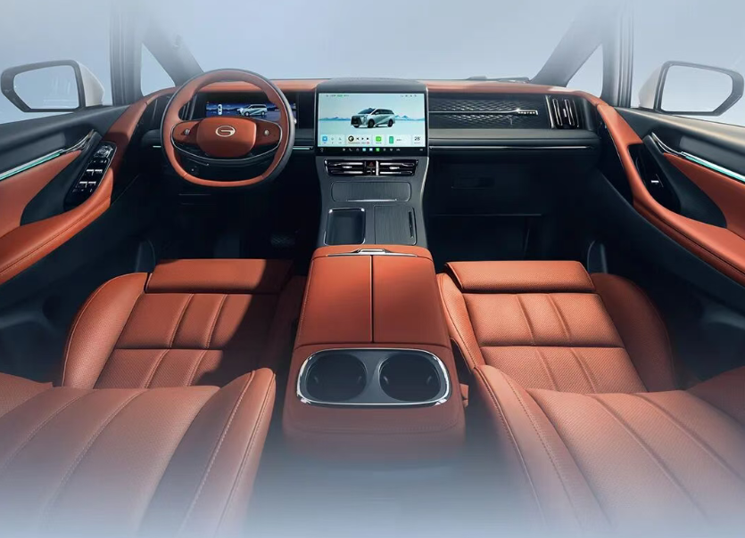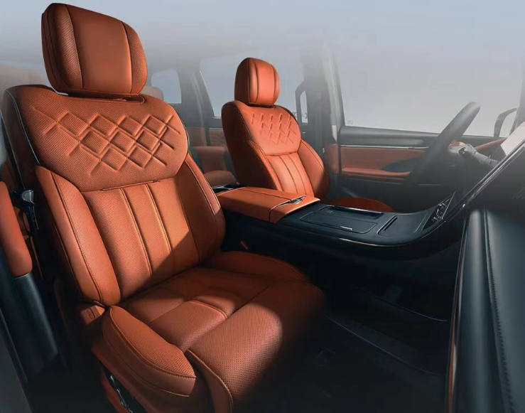 内饰方面,新车采用红棕风格的配色,搭载了15.6英寸悬浮屏和12.3英寸仪表的双联屏设计,以及双辐式多功能方向盘、电子怀挡换挡机构。新车二排为双零重力座椅,支持18向调节、16点式按摩、5英寸扶手屏;三排座椅具备4向手动+头枕手动2向+中央扶手等功能。