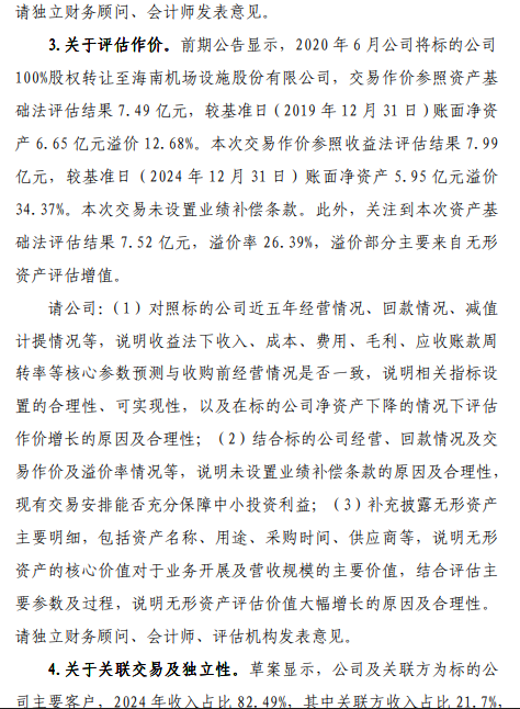 对此,上交所要求海航控股说明在天羽飞训净资产下降的情况下评估作价增长的原因及合理性。同时,上交所要求海航控股结合天羽飞训经营、回款情况及交易作价及溢价率情况等,说明未设置业绩补偿条款的原因及合理性,以及现有交易安排能否充分保障中小投资者利益。