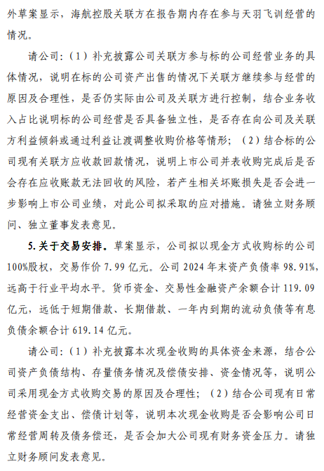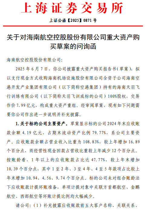6月18日晚,上交所向海航控股下发问询函,就公司拟收购标的天羽飞训的应收账款回收风险、盈利能力、评估作价合理性,以及上市公司本次现金收购的具体资金来源等问题展开问询,要求海航控股说明此次现金收购是否会加大现有财务资金压力。