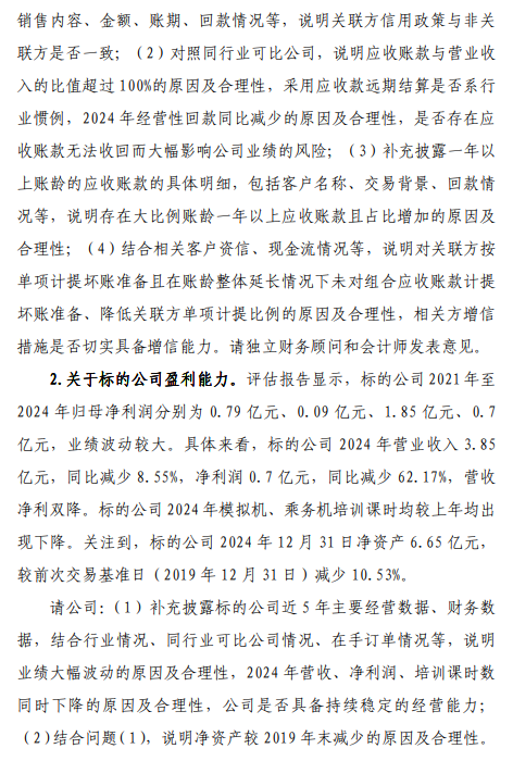 问询函提到,天羽飞训2024年末应收账款余额4.19亿元,占期末流动资产比例79.77%;应收账款余额占营业收入比重为108.83%,较上年增加16.89个百分点,而经营性现金回款占营收比重较上年减少12个百分点。